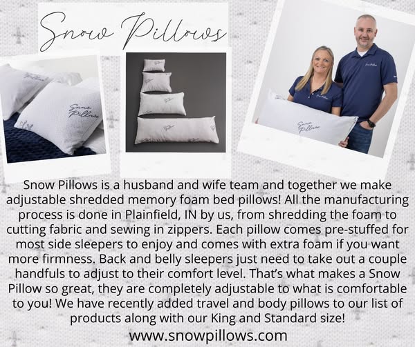 Hello everyone! My husband and I own Snow Pillows, and together we make adjustable shredded memory foam bed pillows from scratch! The idea of the pillow came from my husband as he was tired of throwing money away on a new pillow to only last a handful of months. His prototype pillow lasted 3 years, so we knew we had to start making them so more people can enjoy them! We currently sell standard, king, body, and travel pillow sizes. As new vendors to the Trafalgar Farmers Market we are excited to see everyone all season long!